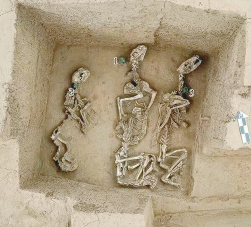 殷墟王陵区一处祭祀坑出土的动物骨骼,数字标注处为铜铃。 中国社会科学院考古酌量所安阳职责队供图