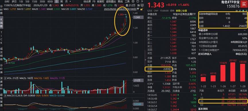 ETF放量冲突上市高点,资金积极进场抢筹!有色ETF华宝(159876)全天获资金净申购1.17亿份,此前20日贯穿吸金,悉数狂揽超14亿元!