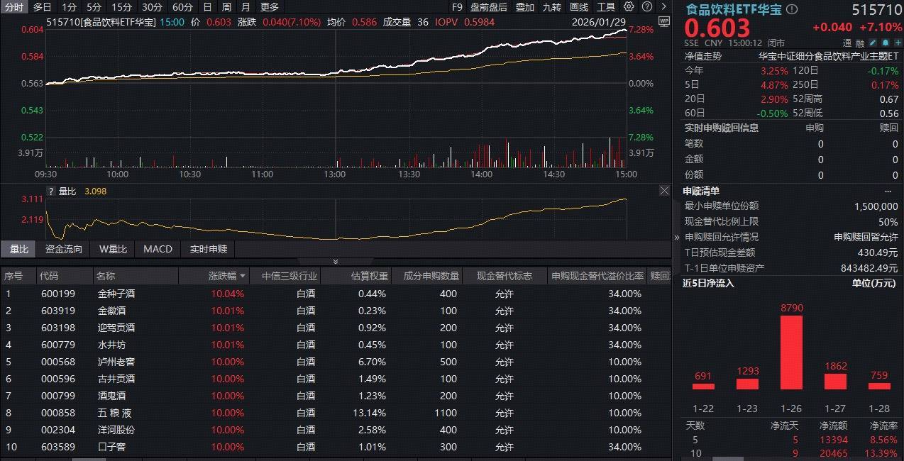 【白酒爆发,17股涨停!吃喝板块午后暴拉,食物饮料ETF(515710)飙涨7.1%连收4根均线!】