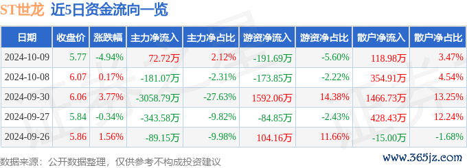 本站音书,落拓2024年10月9日收盘,ST世龙(002748)报收于5.77元,下降4.94%,换手率2.42%,成交量5.81万手,成交额3424.08万元。