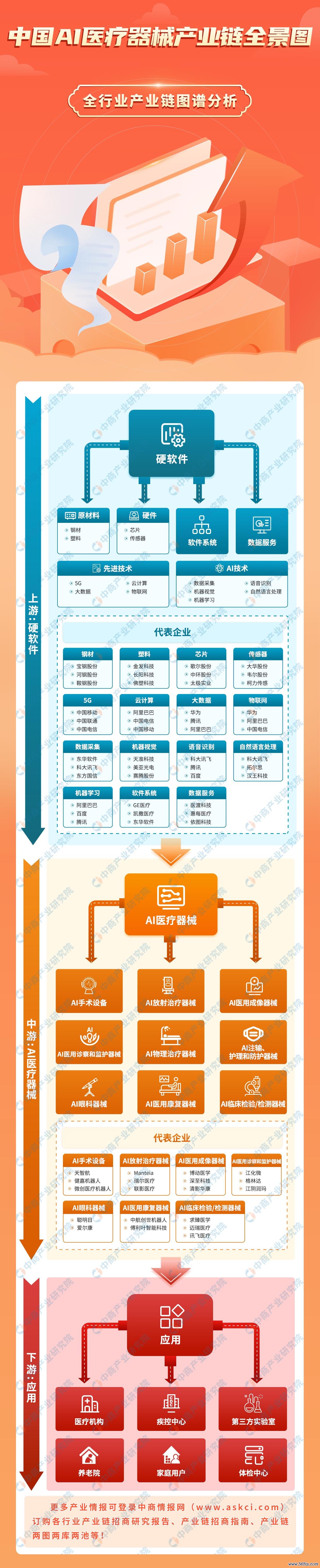AI医疗器械产业链是一个复杂而多维的体系,它会通了东谈主工智能技巧与医疗器械的精髓,为医疗行业带来了翻新性的变革。AI医疗器械产业链上游为硬软件,主要包括原材料、硬件、软件系统、先进技巧、AI技巧、数据做事。AI医疗器械产业链中游AI器械居品,主要包括AI手术开导、AI辐射调节器械、AI医用成像器械、AI医用诊察和监护器械、AI物理调节器械、AI注输、照看和留神器械、AI眼科器械、AI口腔科器械、AI医用康复器械、AI临床覆按/检测器械。AI医疗器械产业链卑鄙诈欺规模,主要包括医疗机构、疾控中心、第三方实验室、养老院、家庭用户、体检中心。