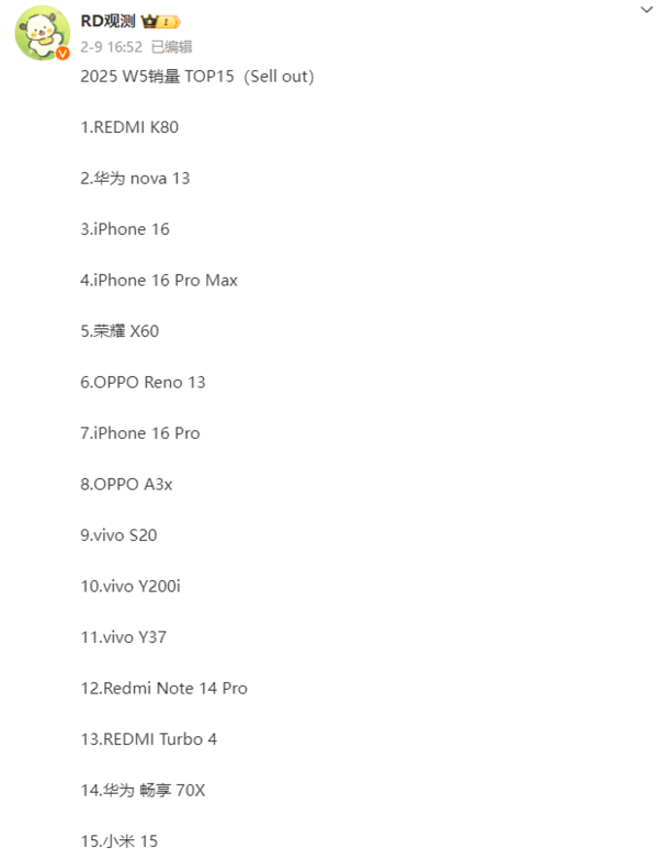 以下是2025年第5周手机销量TOP30: