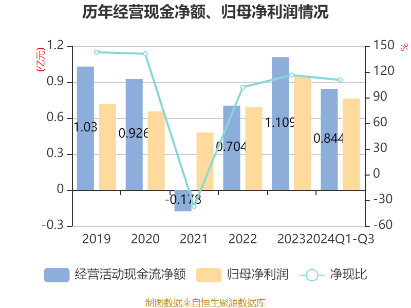 2024年前三季度,公司运筹帷幄算作现款流净额为8439.25万元,同比增长70.85%;筹资算作现款流净额-2712.44万元,同比减少4.71亿元;投资算作现款流净额3827.87万元,上年同时为-1.84亿元。