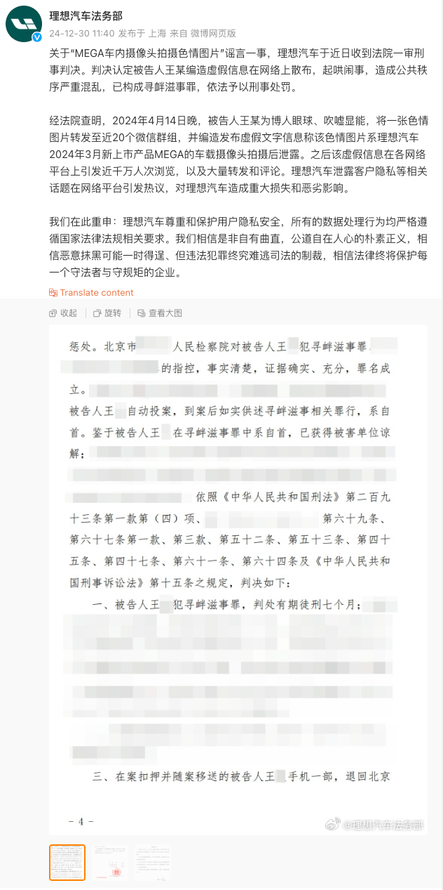 理念念汽车法务部暗意,经法院查明,2024年4月14日晚,被告东谈主王某为博东谈主眼球、吹嘘显能,将一张色情图片转发至近20个微信群组,并诬捏发布诞妄翰墨信息称该色情图片系理念念汽车2024年3月新上市居品MEGA的车载录像头拍摄后裸露。之后该诞妄信息在各采集平台上激发近千万东谈主次浏览,以及多数转发和议论。理念念汽车裸露客户隐藏等商酌话题在采集平台激发烧议,对理念念汽车变成波折损成仇恶劣影响。