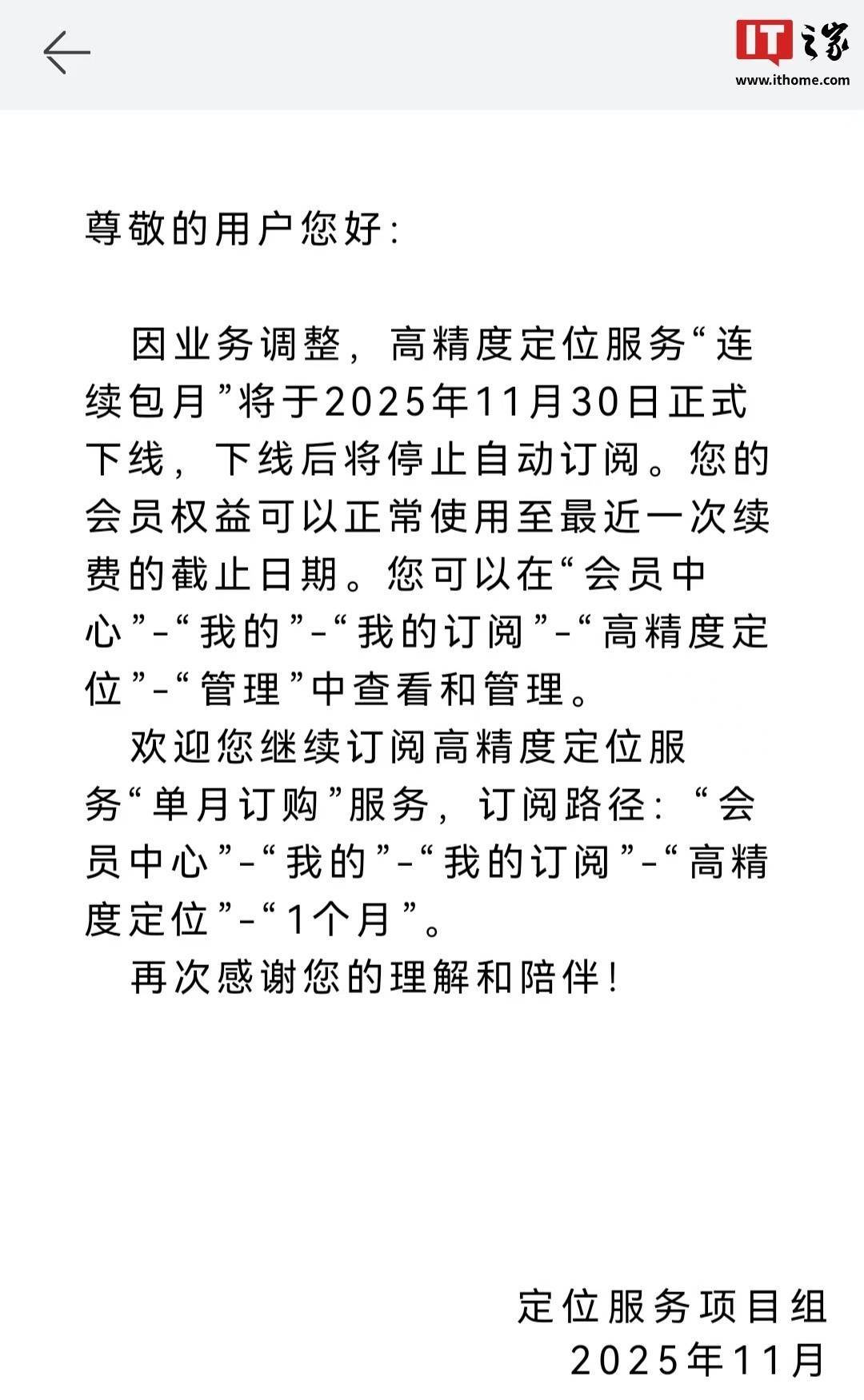 在本年 11 月,华为会员中心 App 发布公告,告示因业务调养,高精度定位就业“相连包月”于 2025 年 11 月 30 日崇拜下线,下线后还将罢手自动订阅。